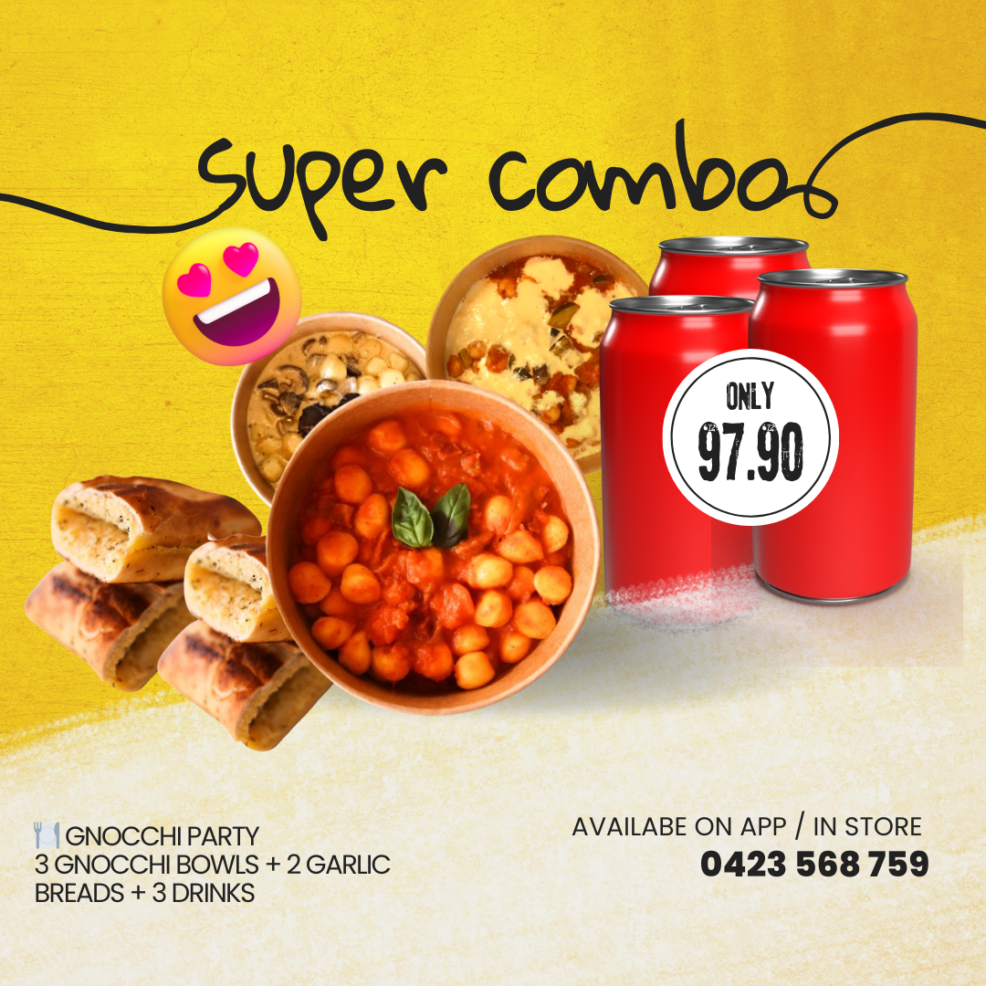 3 bowls of gnocchi, 2 garlic breads, and 3 drinks for $97.90!Bring your gnocchi squad and get ready for the best kind of food coma. 🍽️🔥